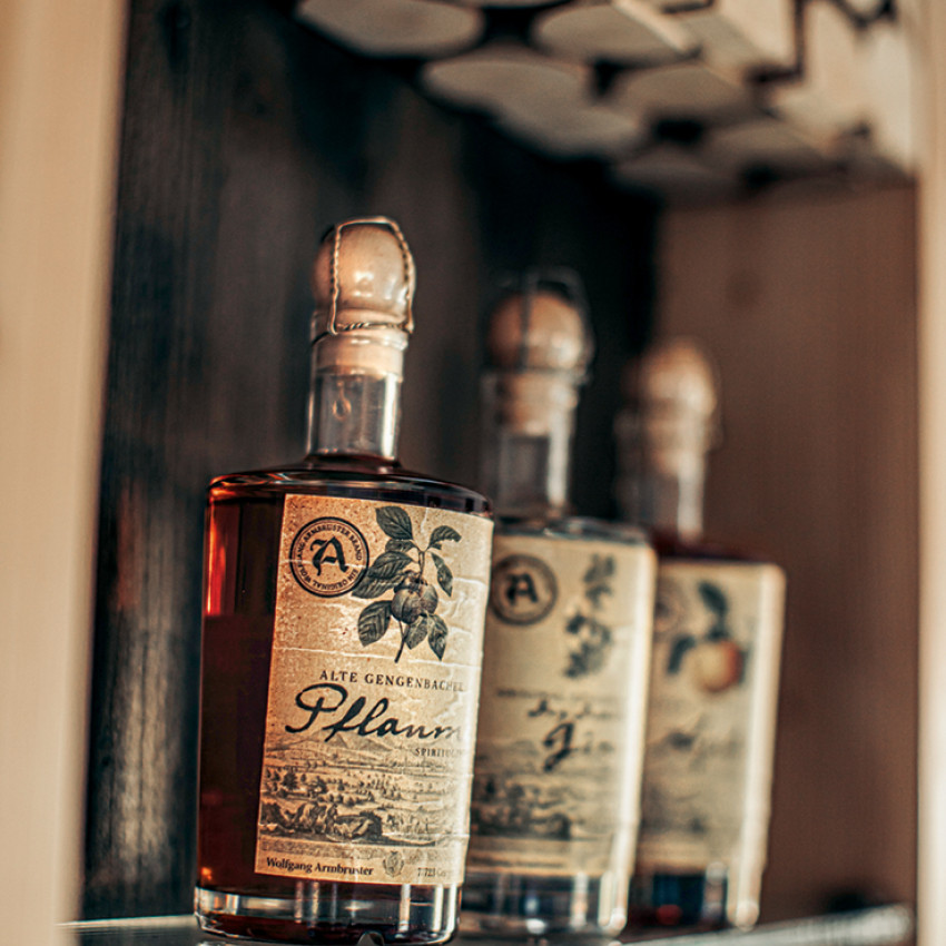 Wolfgang Armbruster folgt mit seinen Bränden dem Zeitgeist: Hochprozentiges soll nicht stark, sondern fruchtig schmecken und eine schöne Farbe haben. So reichert er sein Kirschwasser mit einem Fruchtauszug an. Aber natürlich gibt es das Kirschwasser auch glasklar. Stolz ist er auf seine Gold-Edition, hochwertige Brände, die angesetzt wurden, damit sie intensiver schmecken, wie zum Beispiel Gengenbacher Williams. Seine Eierliköre (18 Sorten!) sind im Hofladen ebenfalls ein Hit. Zu seinen besonderen Empfehlungen zählen Haselnuss und Williams. Als Mann mit Geschmack möchte Wolfgang Armbruster, dass beim Genießer ein „Traum im Kopf abläuft“. Mit aktuell 90 Produkten von A wie Avena Haferbrand bis Z wie Zibärtle kann sich jeder seinen ganz persönlichen Traum erfüllen.